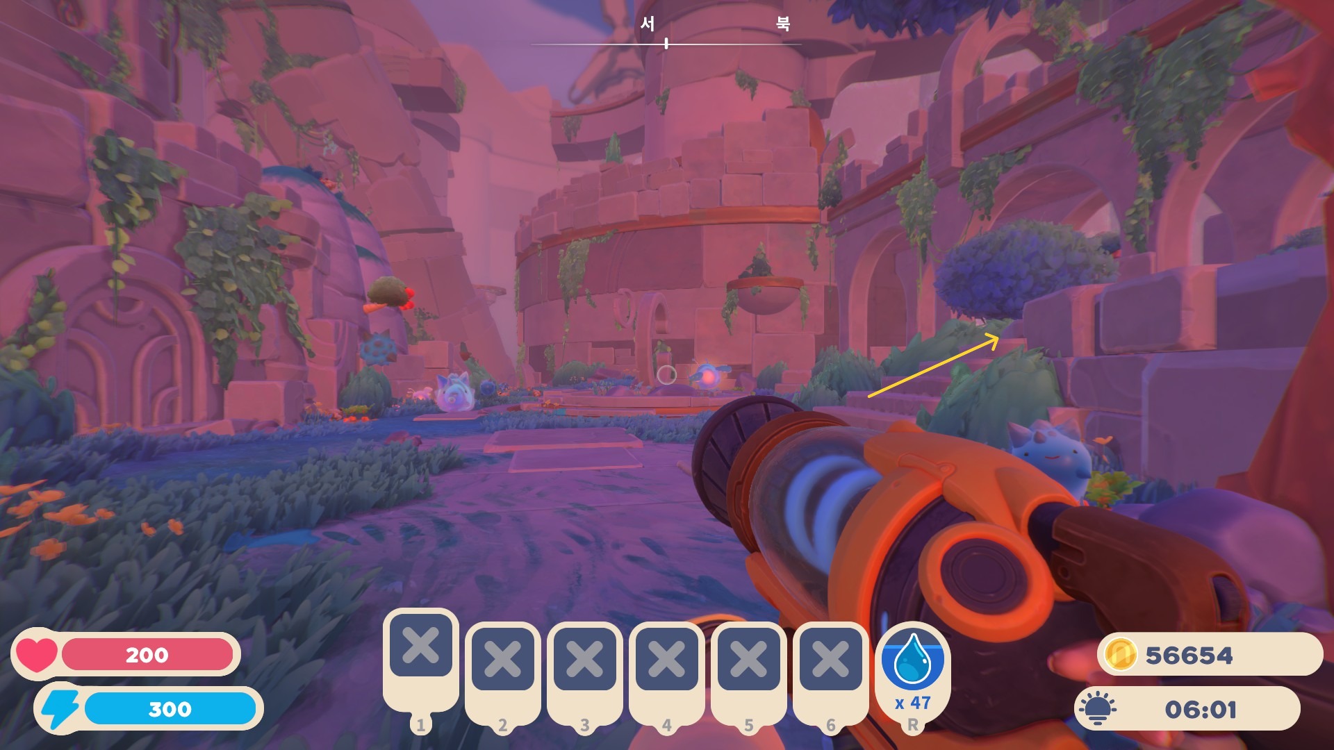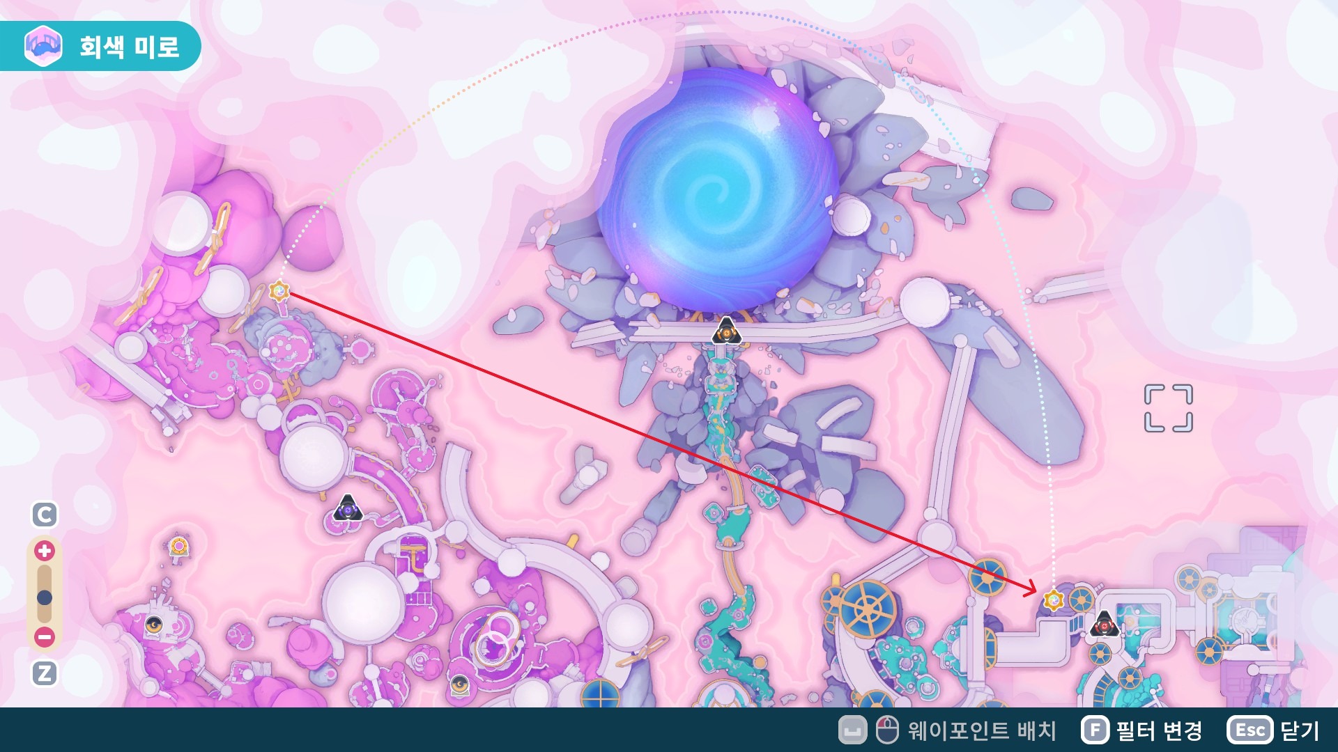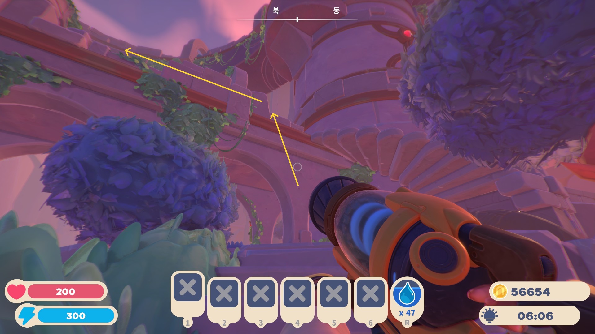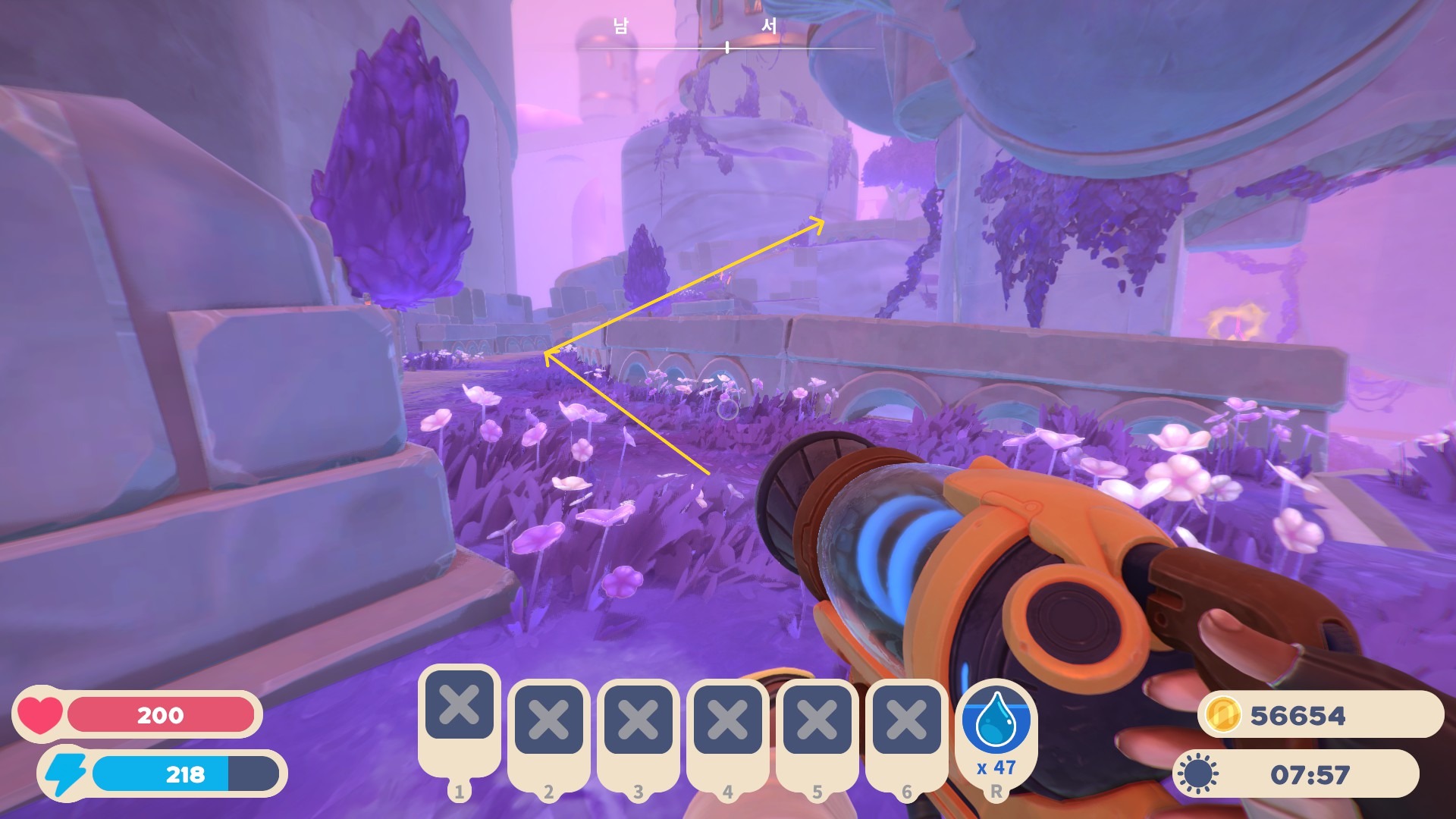 보라색 종을 찾은 뒤, 빨간색 화살선의 시작 지점에서 쿨쿨이 고르도를 터트리면 테라리움으로 향하는 포탈이 생성됩니다.