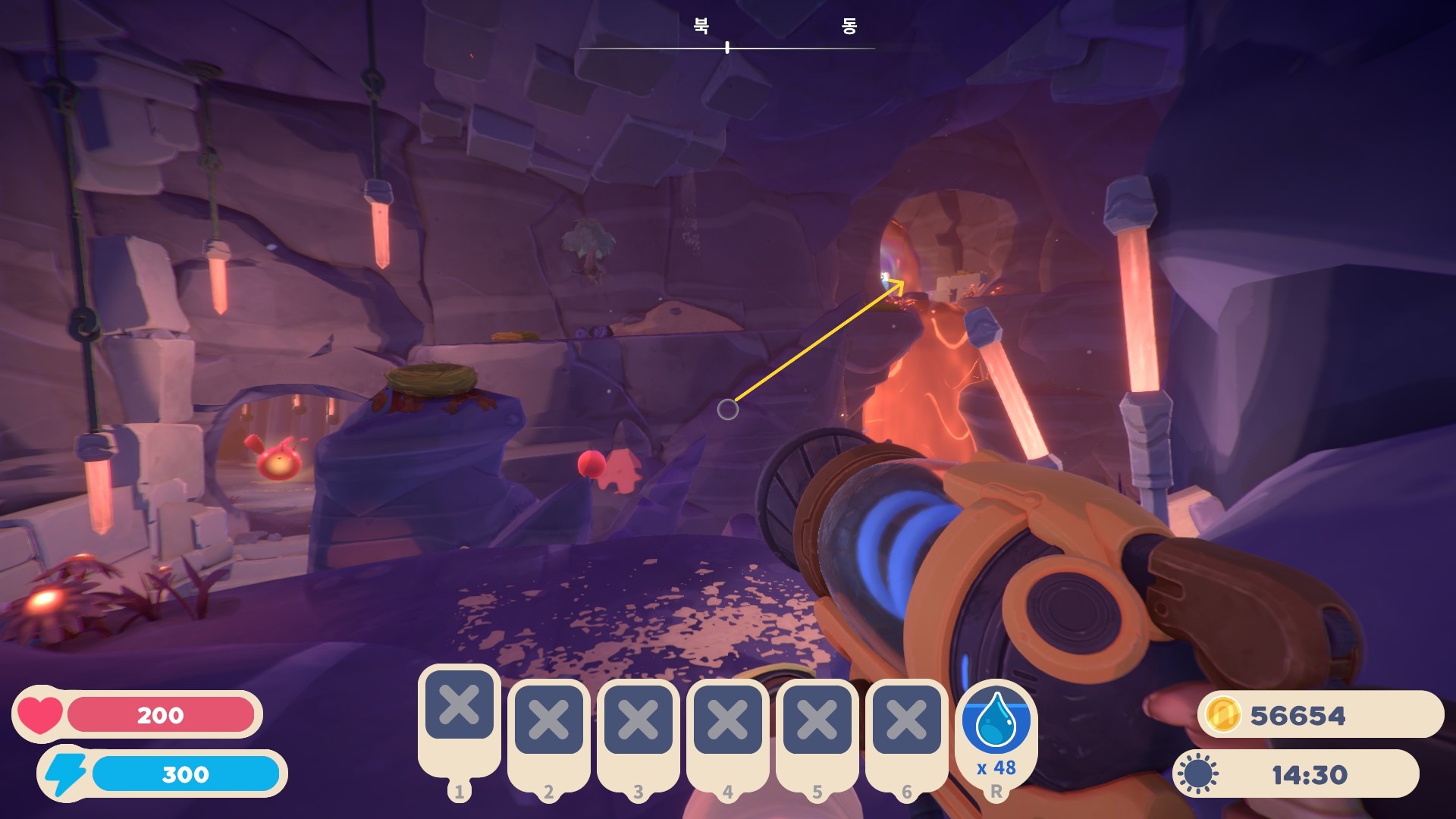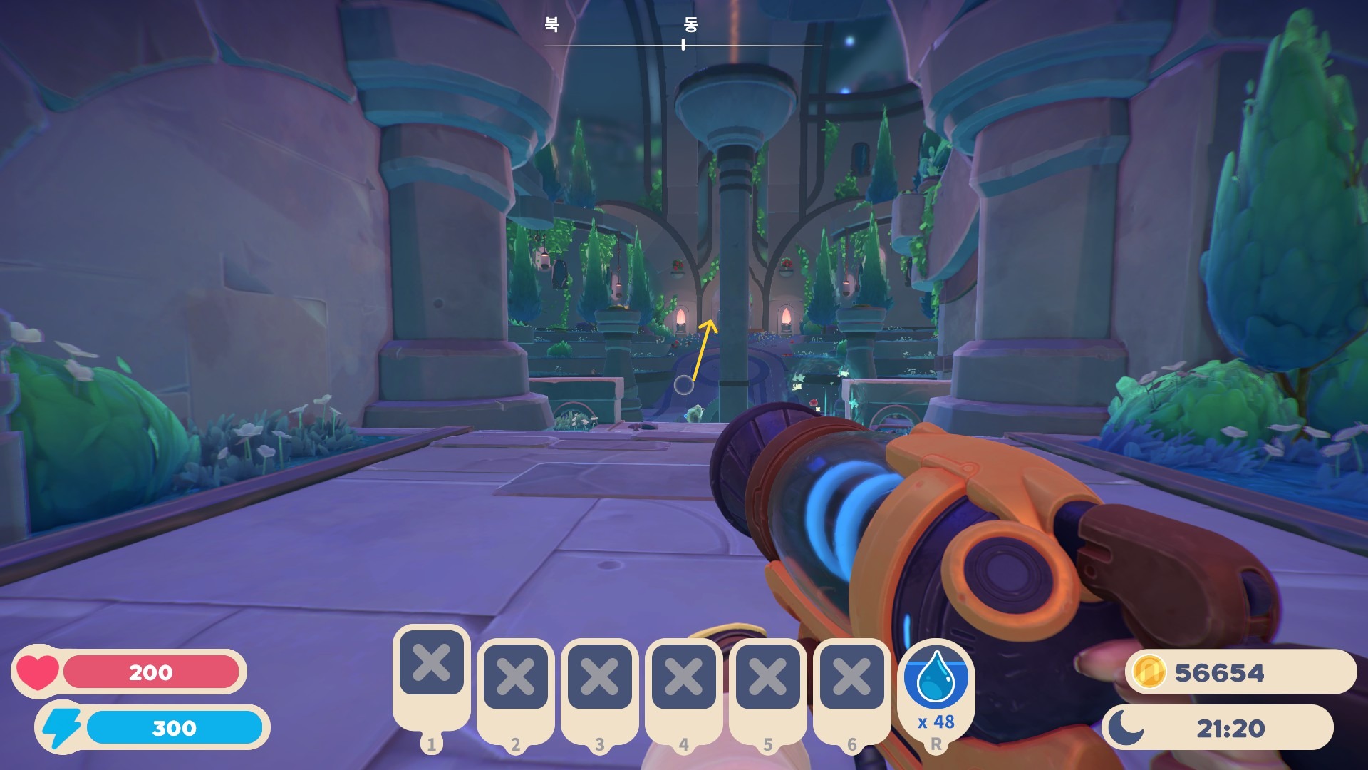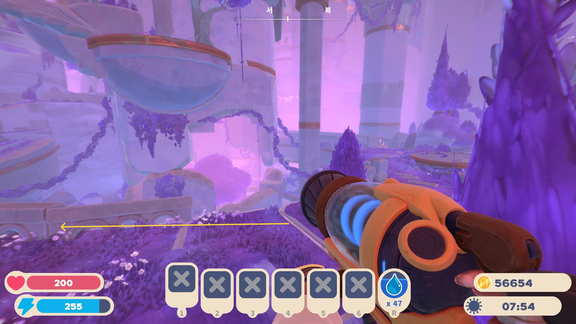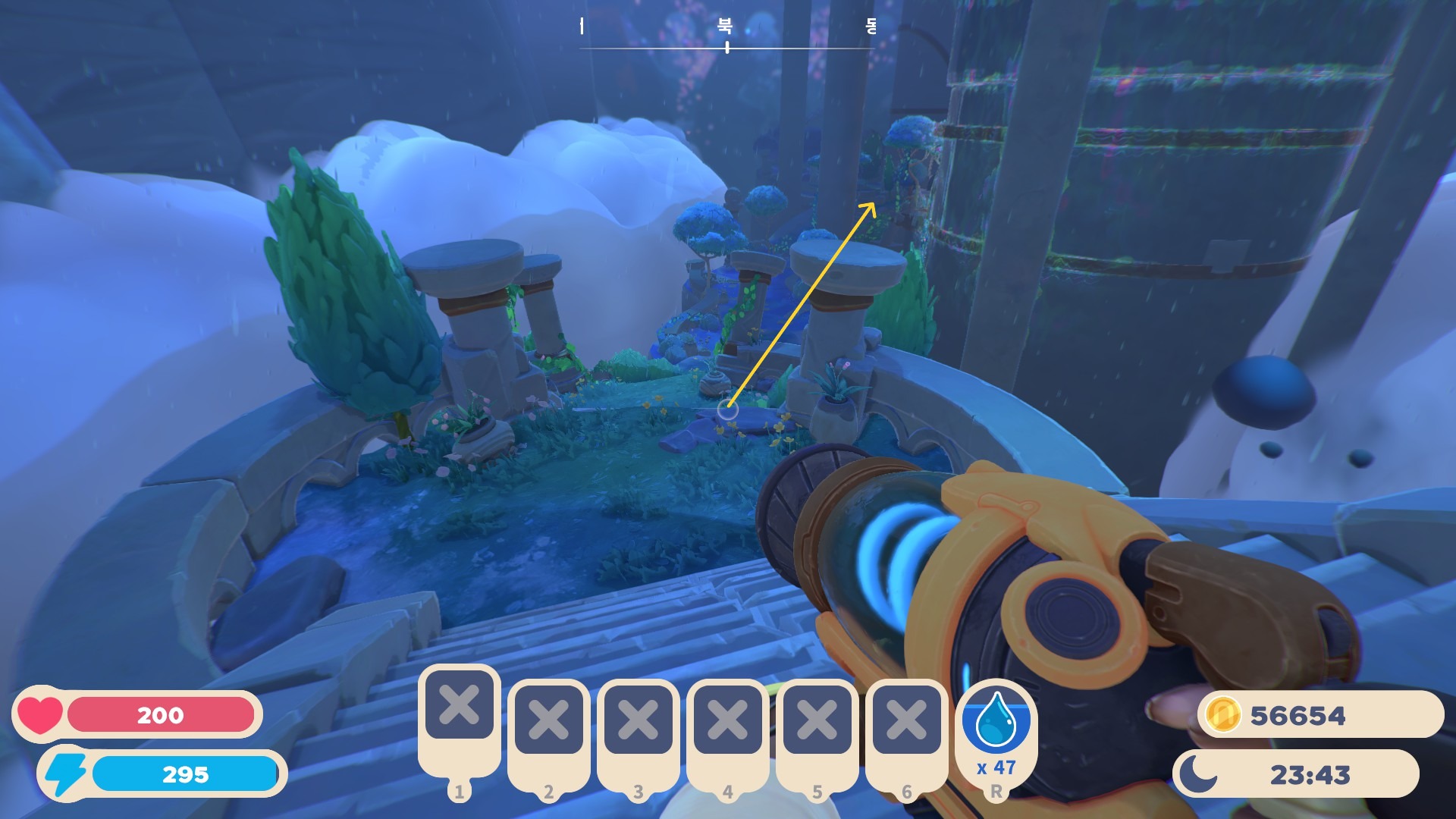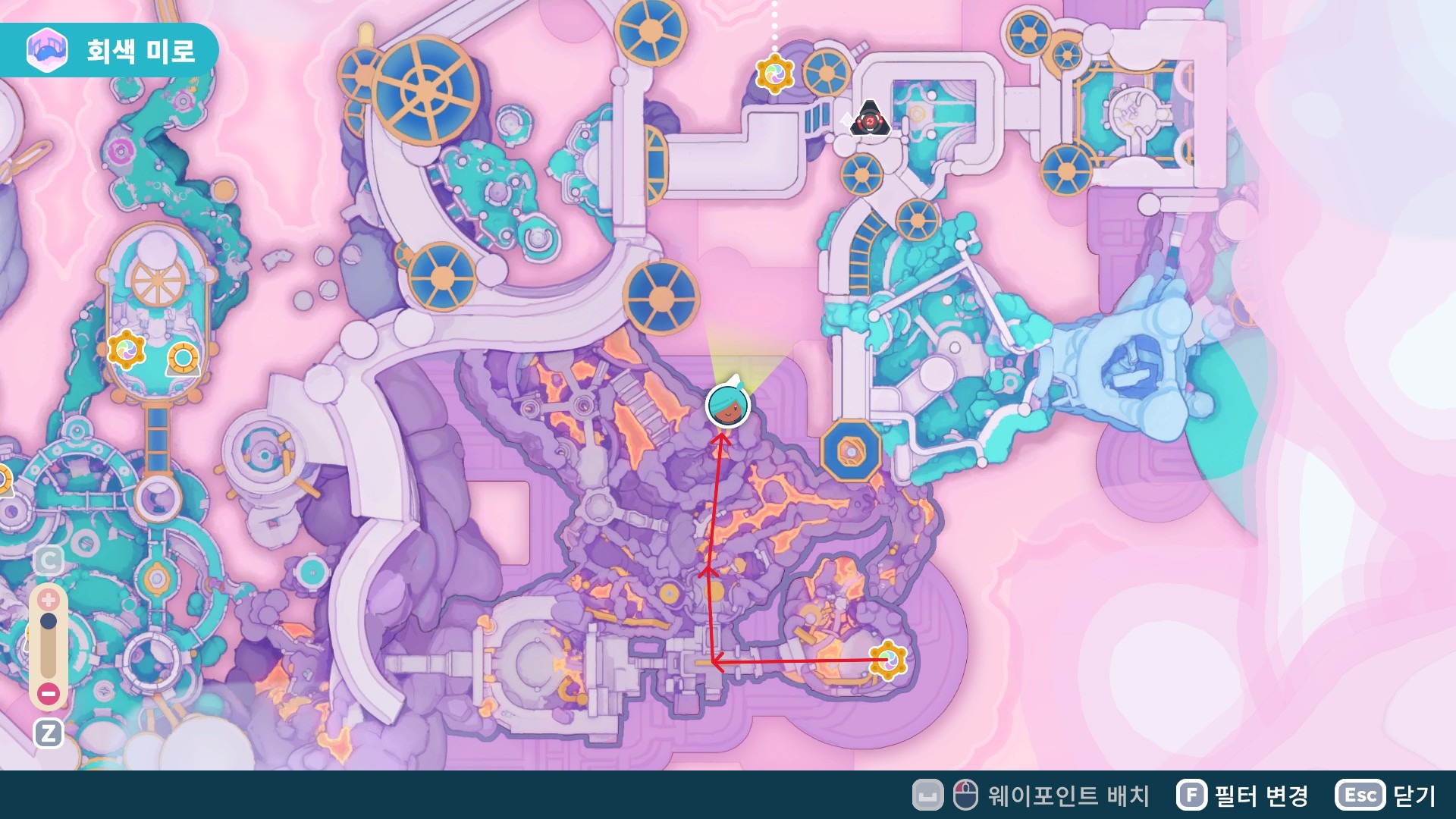 보라색 종을 찾은 뒤, 빨간색 화살선의 시작 지점에서 쿨쿨이 고르도를 터트리면 테라리움으로 향하는 포탈이 생성됩니다.